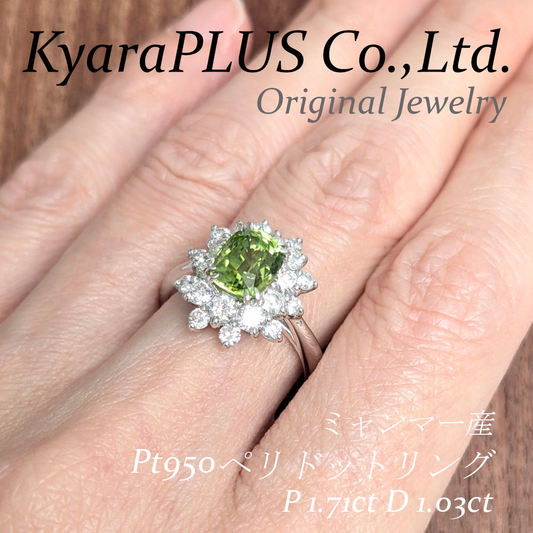 瑞々しく未来を感じさせる若葉色のペリドット。そのまわりを取り囲むダイヤモンドのブリリアンスが、まるで夢のかけらが舞い散るようにきらめき、見るたびに心を躍らせてくれます。
