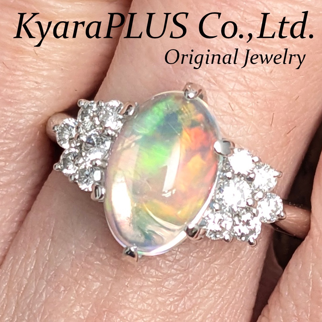もうご覧の通り、つるんつるんでプルンプルンのウォーターオパールに目が釘付けになってしまう一品。無色透明の結晶の中に、ホログラムのようにユラユラと七色の色彩が揺らめき、ひとときとして同じ表情で留まっておりません。赤、橙、黄、緑、青、藍、紫の全ての色が石全体に出ていて、申し分のない美しさです。あなたの指元に、果てしない夢を描いたあの虹の果てが宿る、そんな夢のある輝きです。