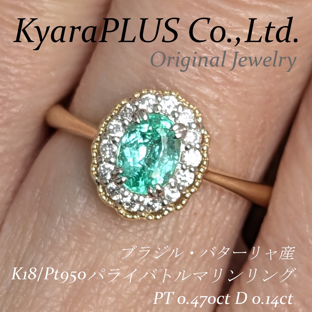 銅とマンガンの含有率がいずれも整数値というだけでも希少性を感じさせますが、特筆すべきはマンガンが「3.56%」に達している点。目を奪うほどに美しいネオングリーンのパライバを、当店オリジナルのデザインで丁寧に仕立てました。