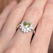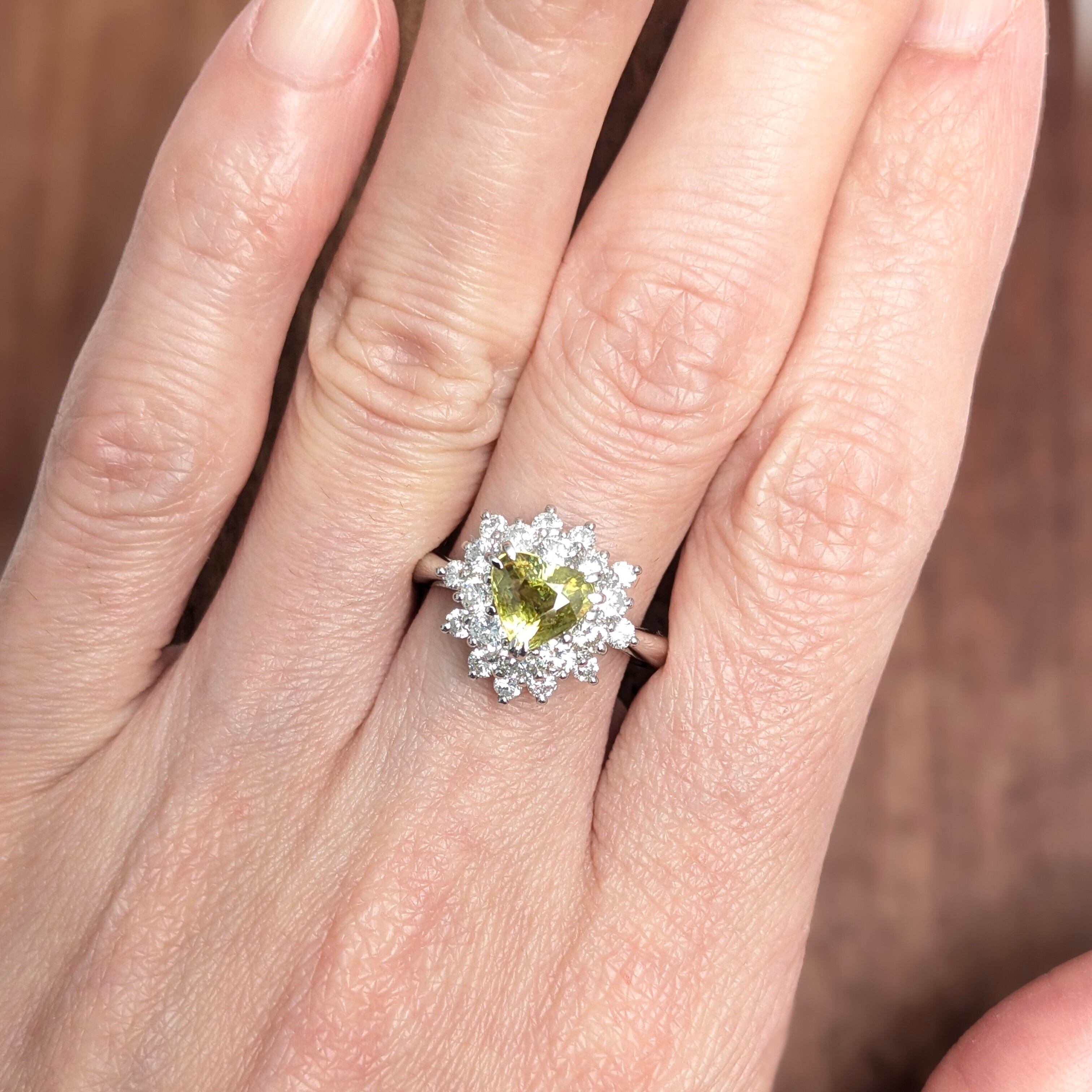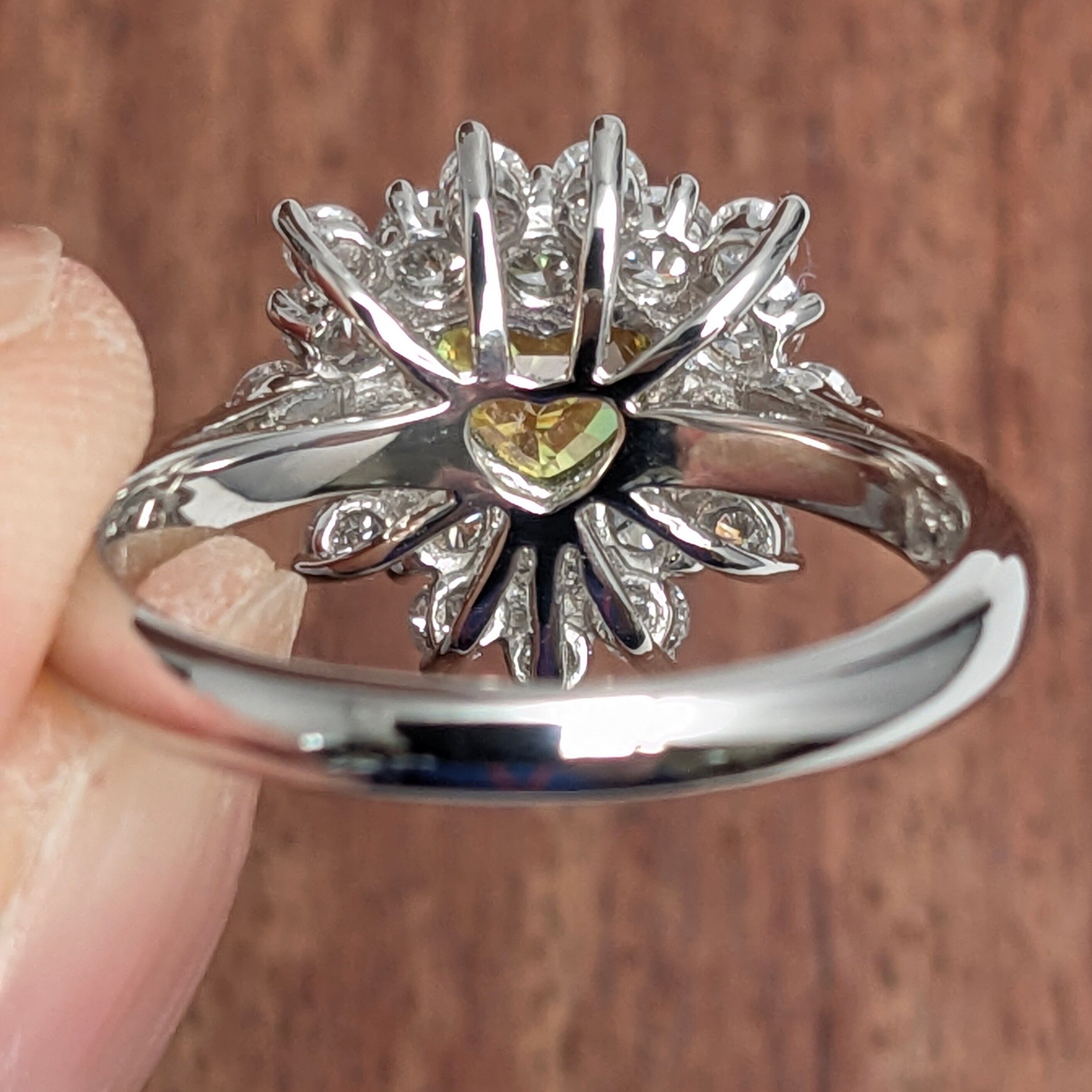 抑えきれない愛がほとばしっているかのように見える、ハートシェイプのスフェーンの輝き。メイン石に負けないように贅沢に配置されたダイヤモンドの煌めきにも目を奪われる、とても華やかなリングができました。ともすれば可愛らしくなりすぎるハートシェイプですが、デザインによってはこんなにも大人っぽいゴージャスなジュエリーになります。