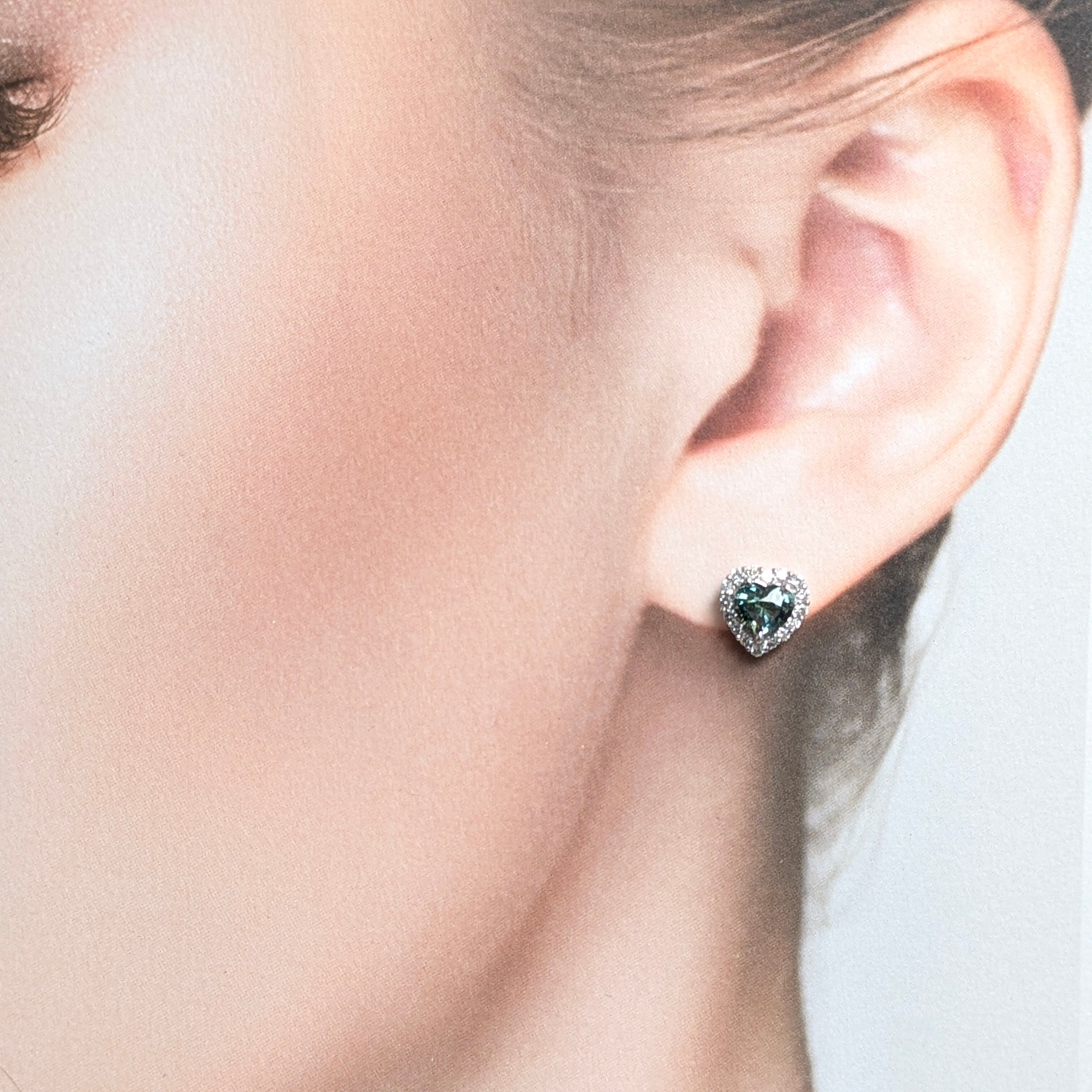 「ティールカラー」と呼ばれる、ブルーとグリーンが複雑に絡み合った幻想的なサファイアを使用したピアスです。ブルーが強めなタイプとグリーンが強めなタイプがありますが、こちらは「ティールグリーン」と呼ぶのにふさわしい、まるで孔雀の羽のように雅やかな輝き。「鴨の羽根の色」という意味の「ティール」という冠ですが、その美しさは自然界のあらゆる場所に潜む奇跡の多彩な色どりを思わせる美しさです。
