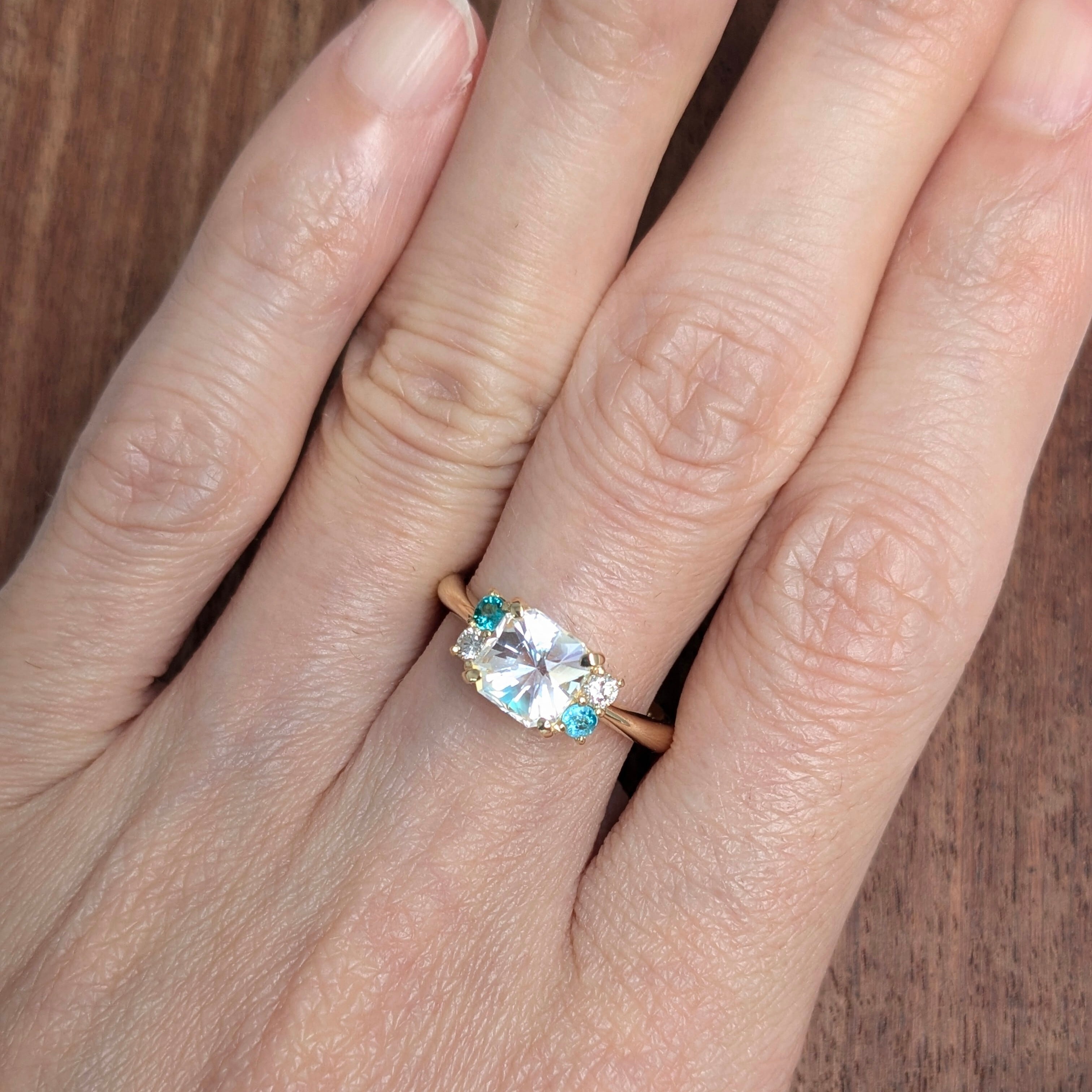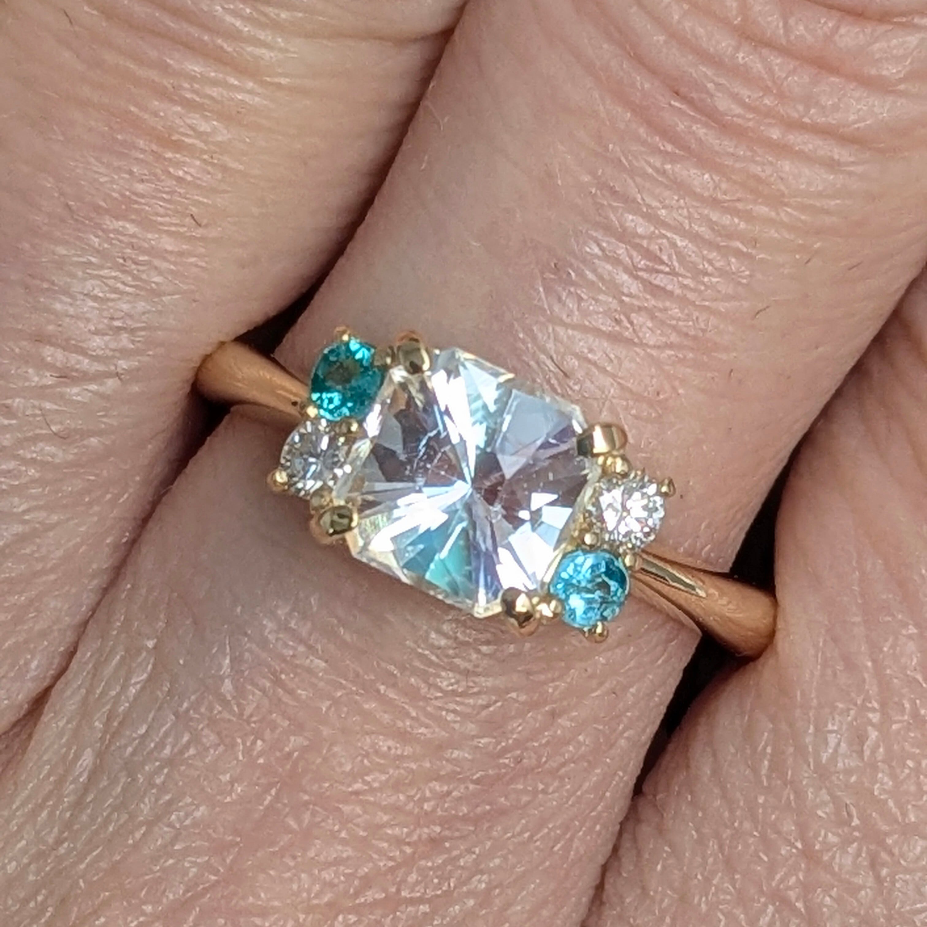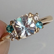 両サイドのパライバトルマリンと、メインストーンのムーンストーンのシラーが呼応しているのが伝わりますでしょうか?限りなく無色の美しい結晶に、ブルー系と、そして動きに合わせて浮かび上がるオレンジ~イエローのシラーが夢のように美しいリングに仕上がりました。アクセントで使用されているパライバトルマリンも、当店で直接ブラジルから仕入れてきた厳選しものです。日々の生活にそっと優しく光を灯してくれる、そんなリングです。