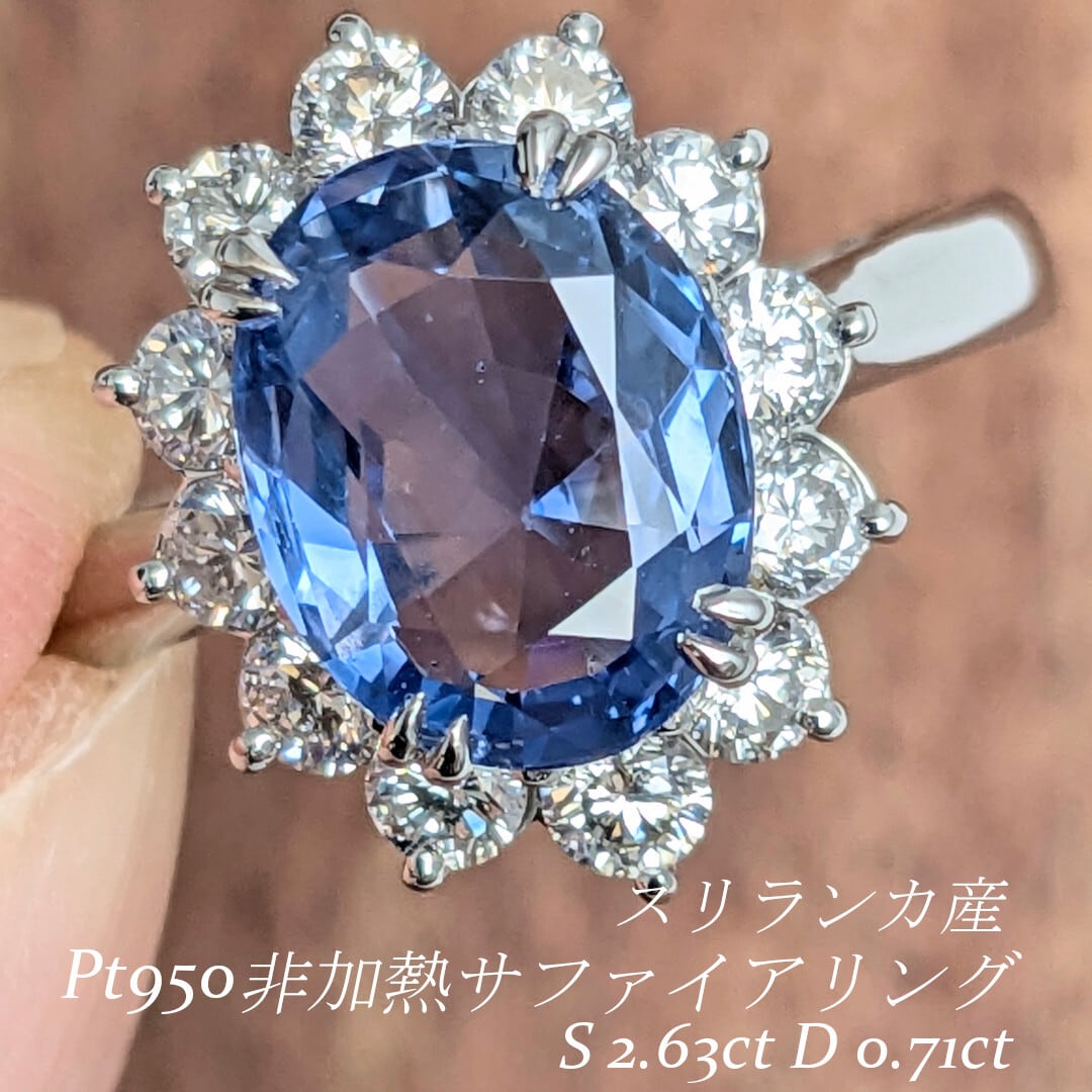 Pt950非加熱サファイアリング スリランカ産 非加熱サファイア 2.63ct ダイヤモンド 0.71ct【PRO207646】