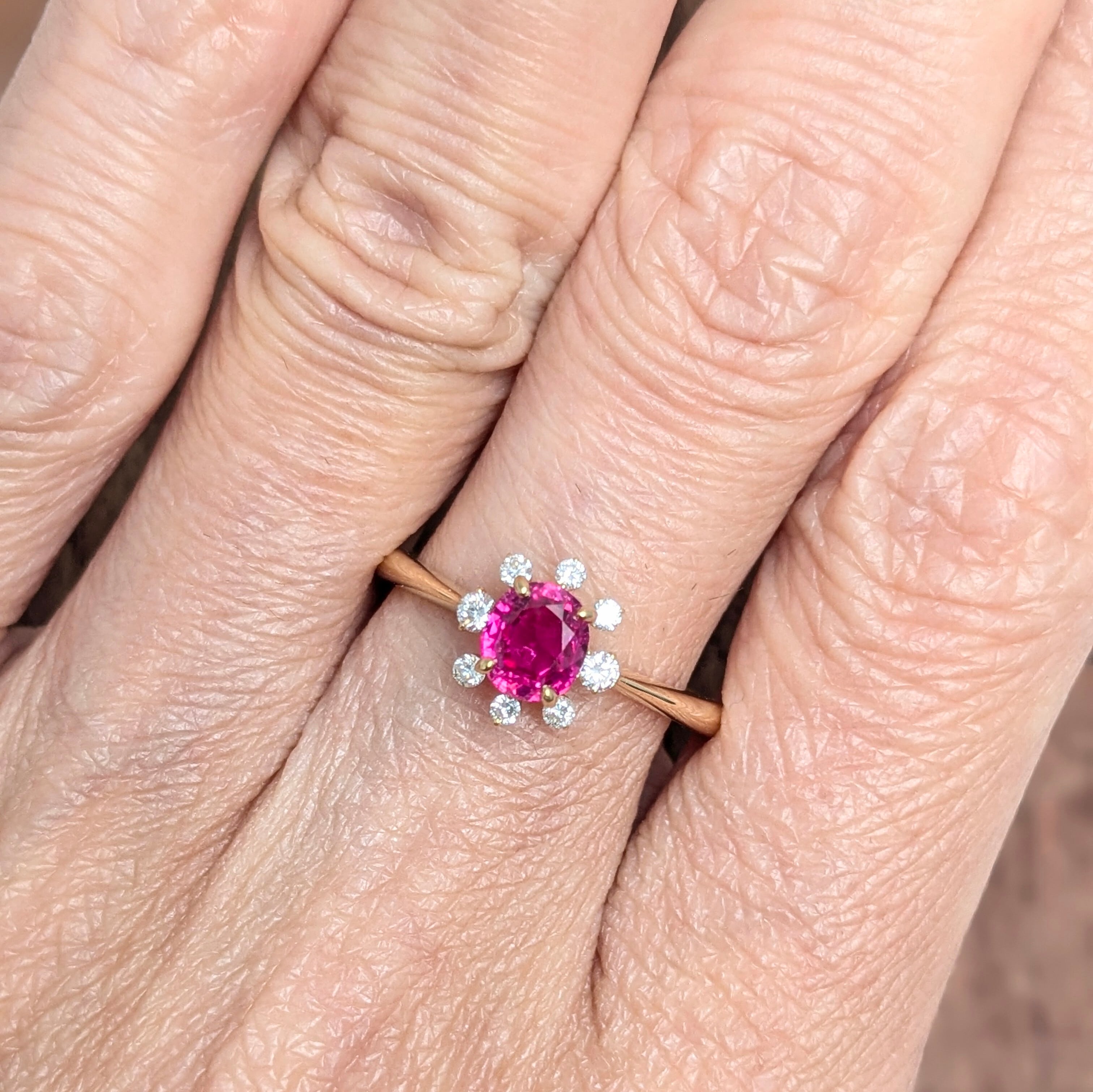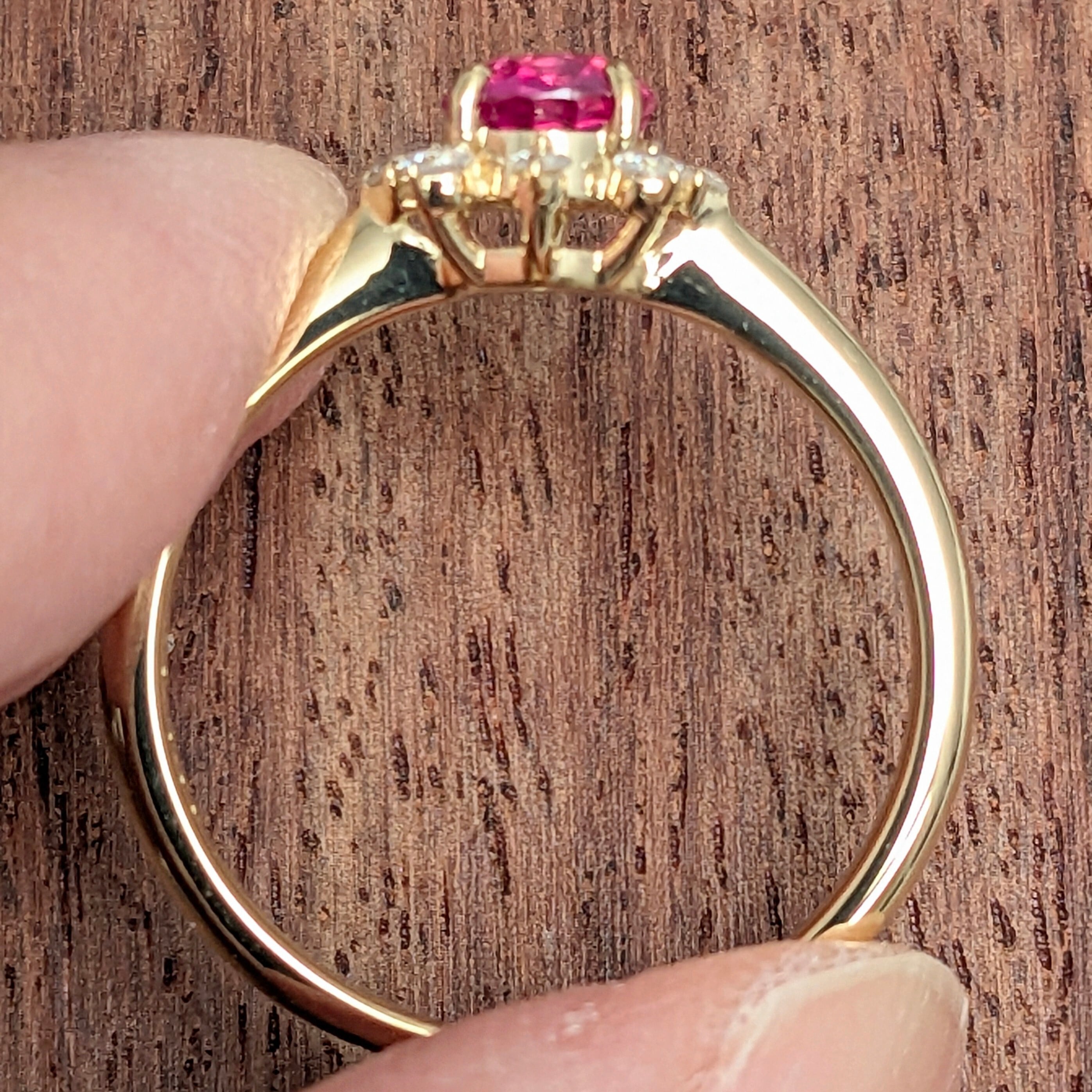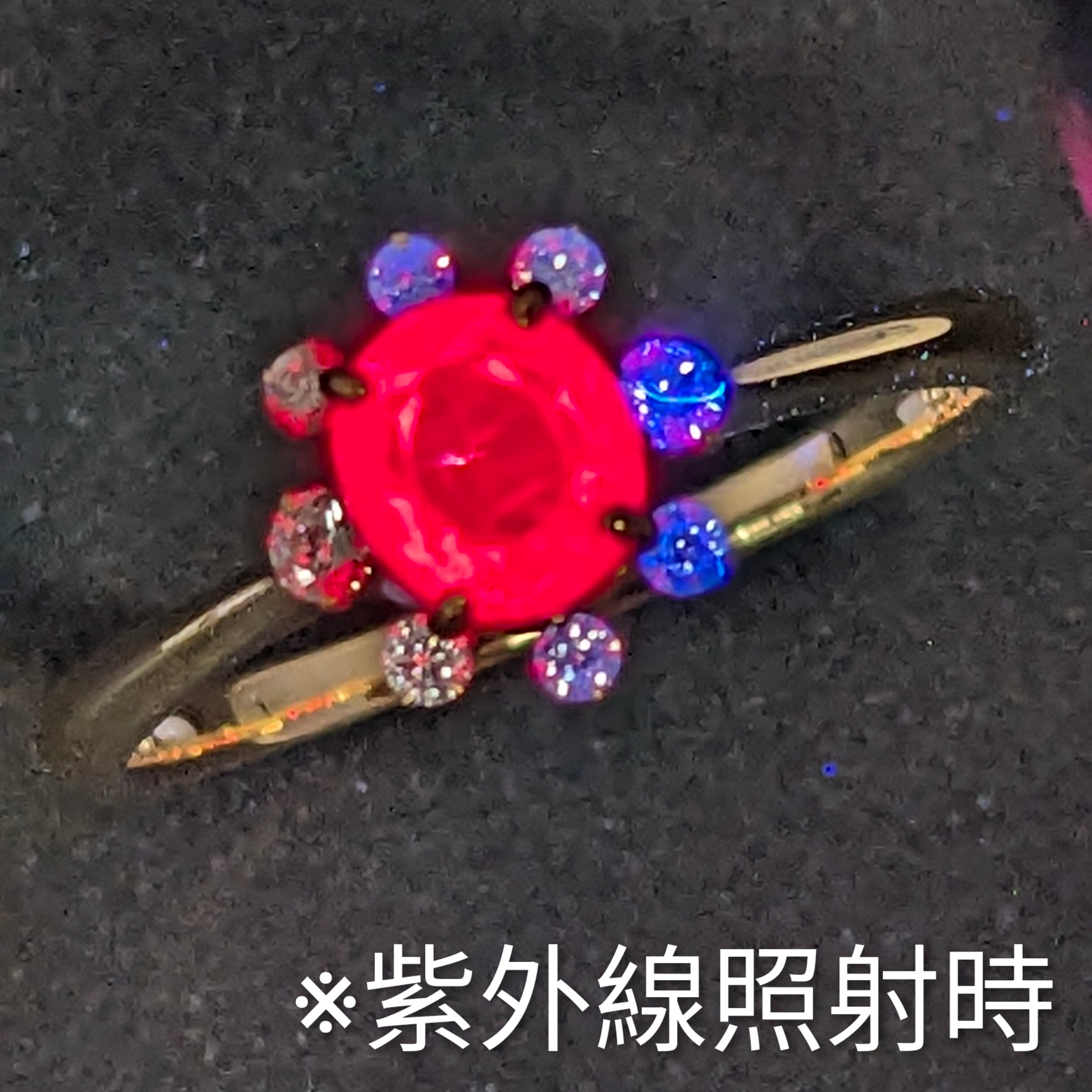 まるで小さな線香花火がパチパチと爆ぜる様子を宝石にしたような、光のスパークが印象的なリング。センターの非加熱ルビーはわずかにピンキッシュで、とても鮮やかな“強赤色蛍光”を持った石です。0.68ctと大きさはさほどありませんが、それを補って余りある鮮やかな色合いが印象的!その色と輝きを邪魔しないよう、イエローゴールドに溶け込むわずかに黄色味を帯びたメレダイヤの煌めきも、輝きにアクセントを添えてくれています。