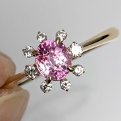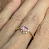 夏の夜空に「ニパッ」と大きく咲いた打ち上げ花火のように、花開いたデザインのリング。メレダイヤ同士が離れて配置されている点がポイントです。メインのピンクサファイアは、「パステル・ピンク」のカラーグレード。イエローゴールドの艶めきに後押しされて、ダイヤモンドの輝きと共にとても可憐な美しさを放っています。ピンク色は老いも若きも女性も男性も人の心をウキウキさせる魔法を持っています。身に着けるあなたにも、そしてそんなあなたと時間を共にしてくれるお相手にも・・・☆