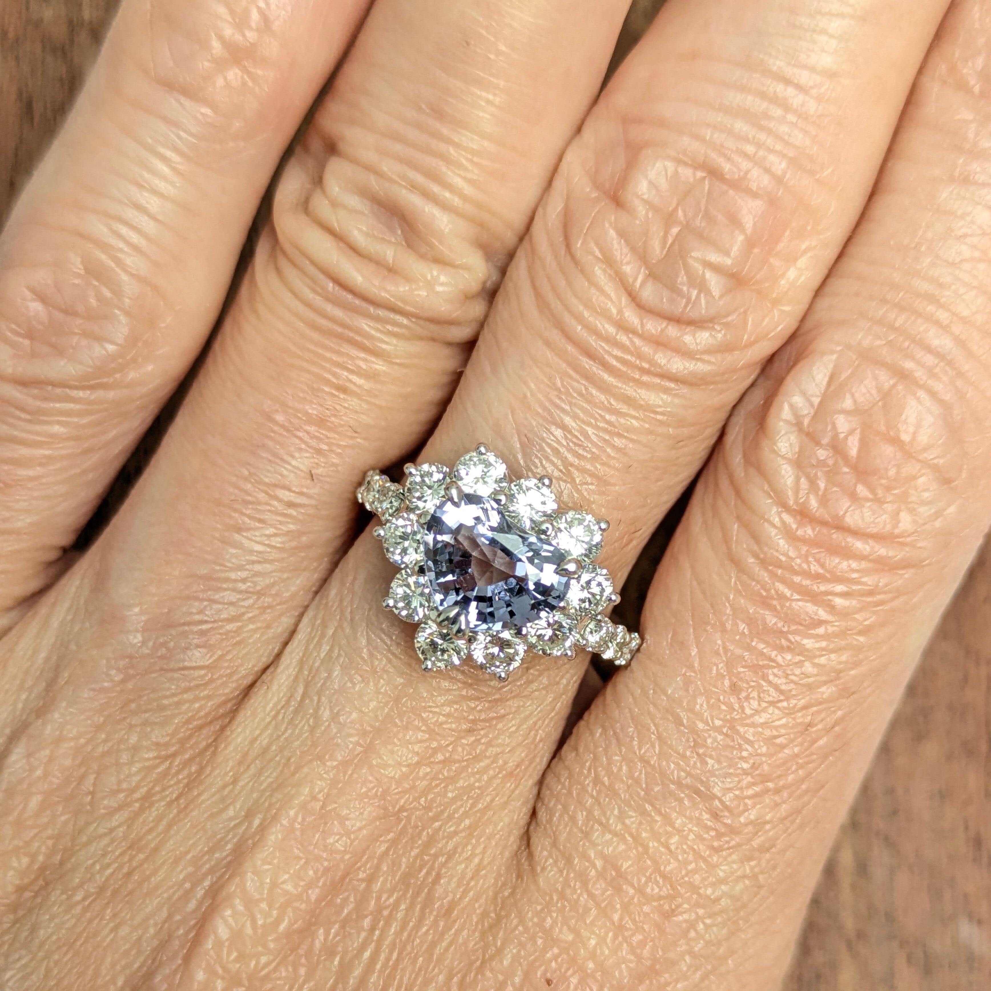 高貴なパープル・カラーに、厳かなグレー味が影を落とす神秘的なスピネルを使用したリング。当店のオリジナル、厳選したメレダイヤを使用して仕立てた一品です。なんとも表現が難しいその色合いと透明度は、その空間の中に流れる空気の音さえも聞こえてきそうなほどの“静謐”を湛えた美しさ。その控えめな姿に反した眩いまでの輝きに、つい見入ってしまう美しさです。宝石とは不思議なものだなと、改めて感じる一品になりました。