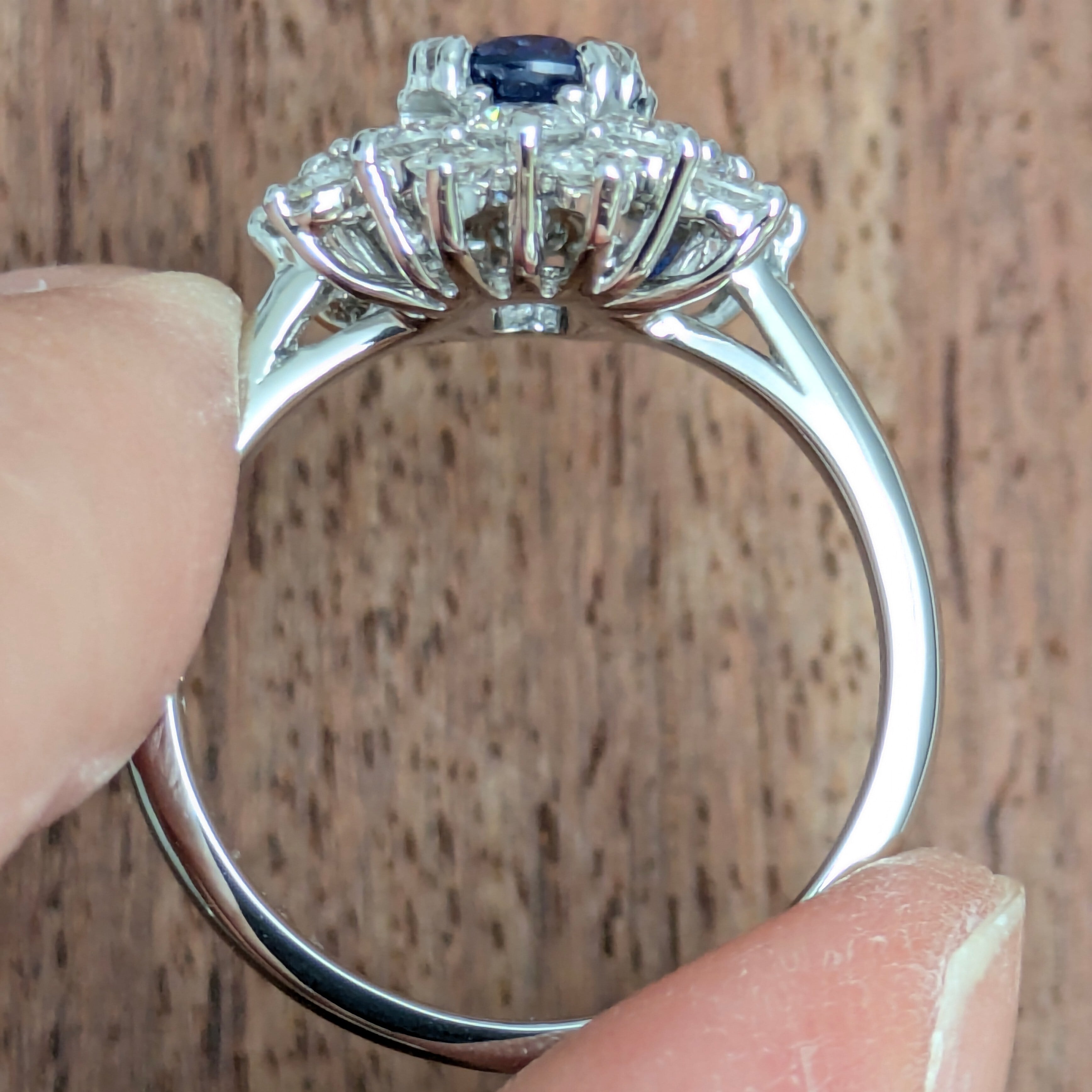 個人的には当店の中でもイチ押しのデザイン、メレダイヤで二重取り巻きにしたサファイアリングです。ファスト・ファッションに注目が当たる中、「何か一アイテム、心が浮きだつようなアイテムが欲しいな」という気持ちになった時に、特別なジュエリーを一つ取り入れるだけで気分が上がります。それが「気品あふれる高貴なブルー」だった時には、その日の立ち居振る舞いもワンランクアップしそう!特別なブルーです☆
