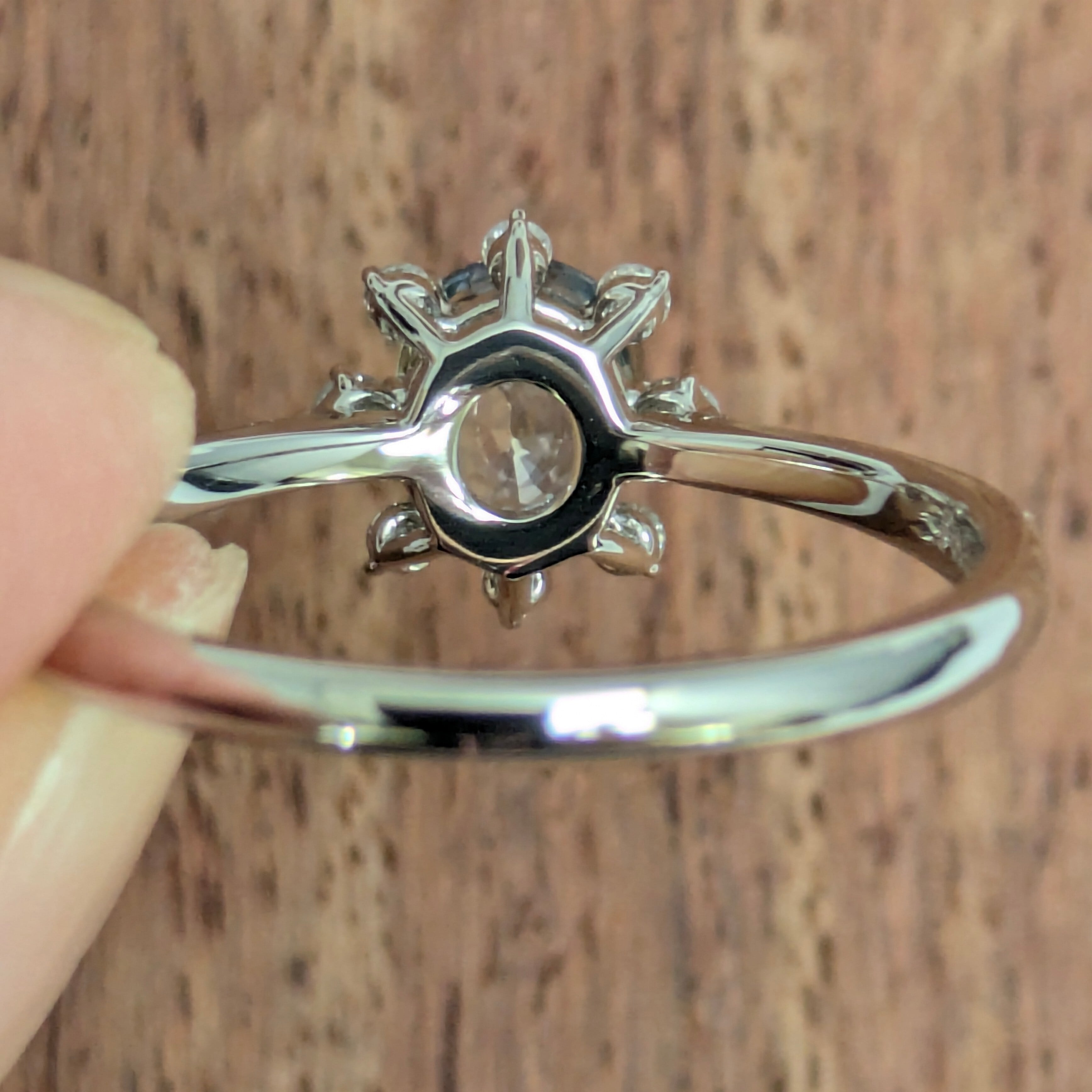 中央部分がほんのりとイエローで、長手方向の両端がブルーのバイカラーのサファイア。その色合いは本当にほんのりで、その儚い色合いによってかえって強調されているサファイアの透明感と“テリ”に目を奪われます。当店オリジナルの、このメレダイヤが点々と離れて配置されているデザインは、より微かな色合いの変化や光学効果を持った石を繊細に見せてくれる効果があります。毎日はめていたい、そんな煌めきです。