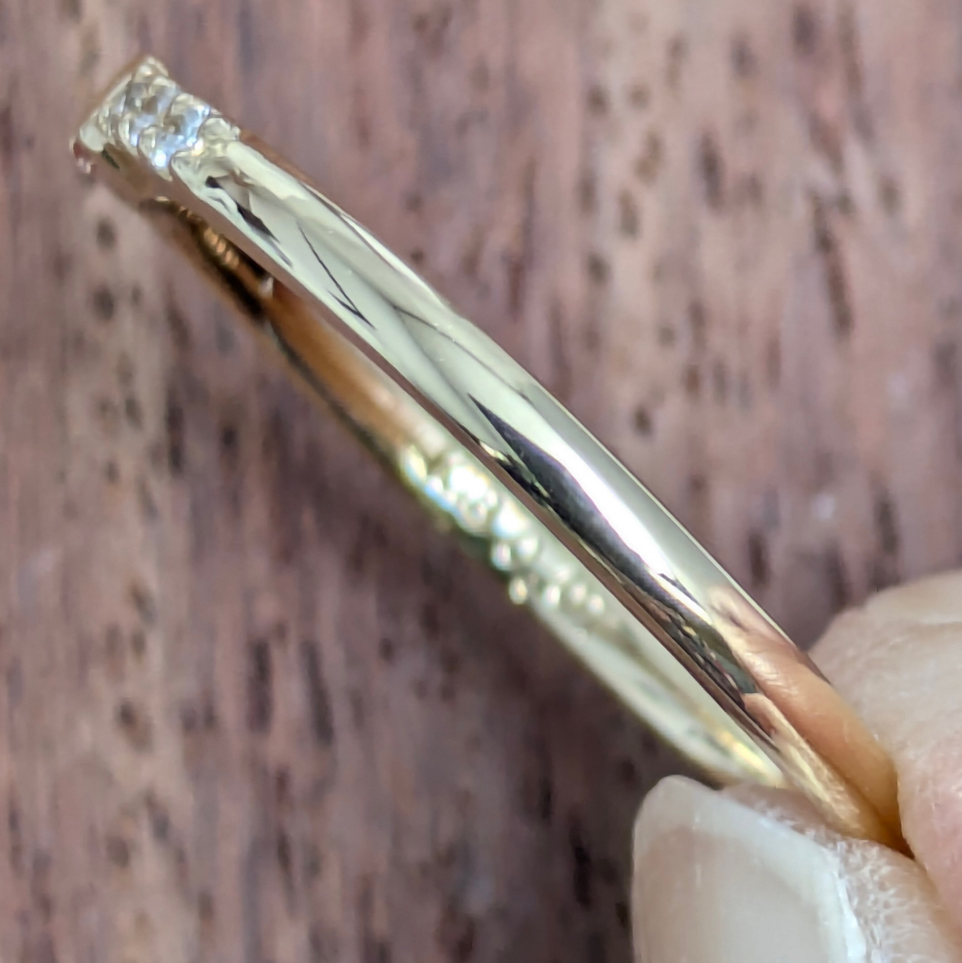 発色の良いピンク色のスピネルと、シンプルなアウトラインで仕立てたK18のリング。素材に自信があるからこその、勝負したデザインです。メインの鮮やかなピンクサファイアは、もちろん太陽光の下でその美しさを最大限に発揮する“強赤色蛍光”の性質を持つものを使用。そして両サイドに三銃士のように寄り添っているメレダイヤは、わずかに黄味があるものですがイエローゴールドとうまくマッチして、煌めきを添えてくれています。シンプルですが、華やかさも併せ持つリングです。