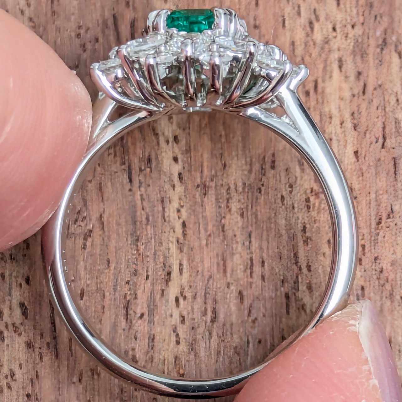 煌めく水面に一葉の葉が揺れているかのような、色の美しさと輝きがとても際立つリング。まだ外は寒い日々が続いていますが、早くも春の「生命の息吹」を感じさせる瑞々しさです。透明感のある美しいグリーンに内包されたインクルージョンは少なくはないですが、肉眼で濁りを感じるようなものではありません。贅沢な二重取り巻きのメレダイヤの輝きを従えた、堂々としたゴージャスなエメラルドリングです。