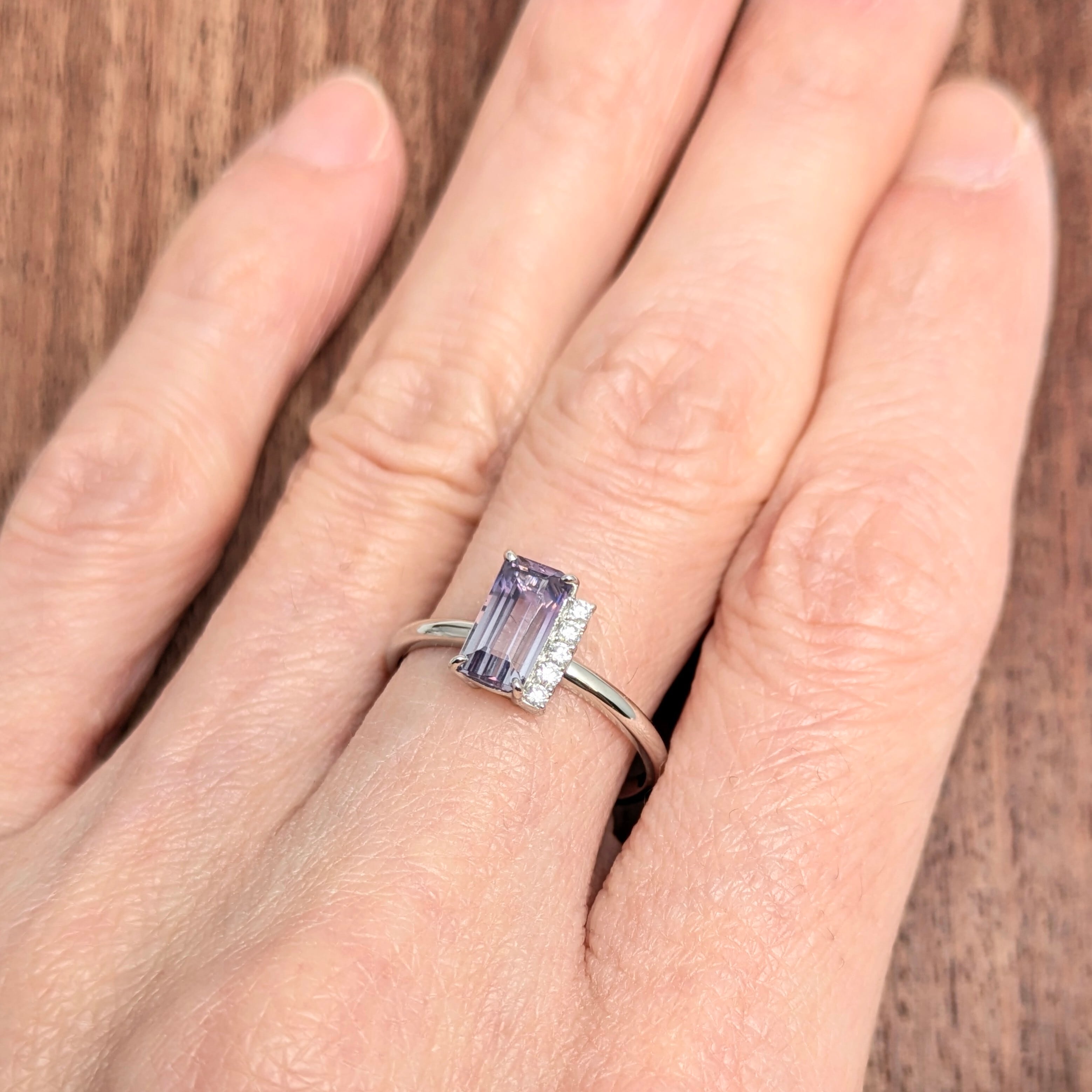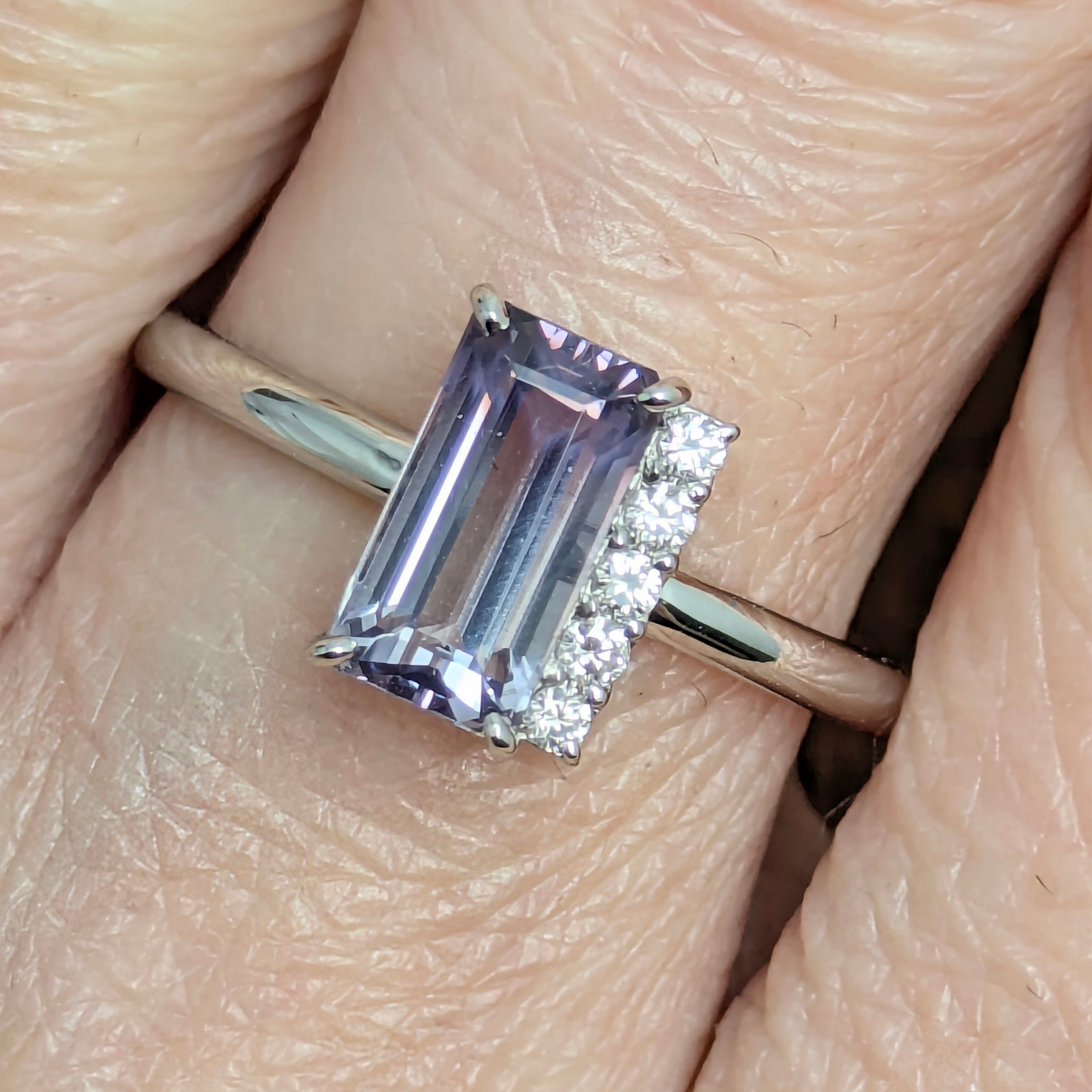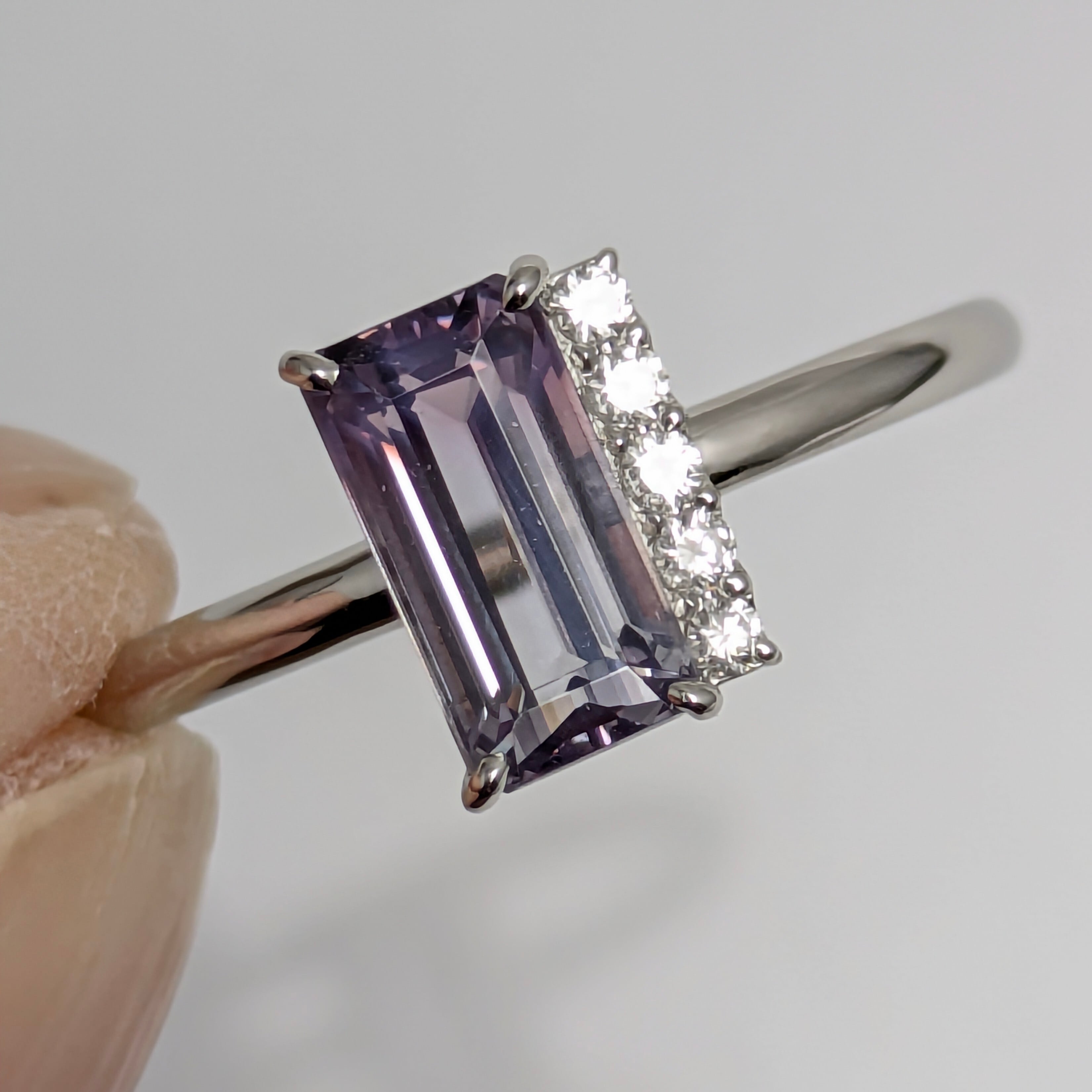 艶やかにグラデーションになっている、バイカラースピネル。その動きのある色の流れに倣うように、アシンメトリーに配置された5粒のダイヤモンドの煌めき・・・。当店オリジナルのデザインですが、仕上がりを見た瞬間にスタッフも「わあ・・・!」と声を上げてしまうほどのエレガントな仕上がりになっています。スピネルの強靭な性質とは対照的な、今にも消えそうな儚げなその色の移ろい・・・。あるべき対称性を排除することで、とても心を惹かれる魅惑的なリングに仕上がっています。