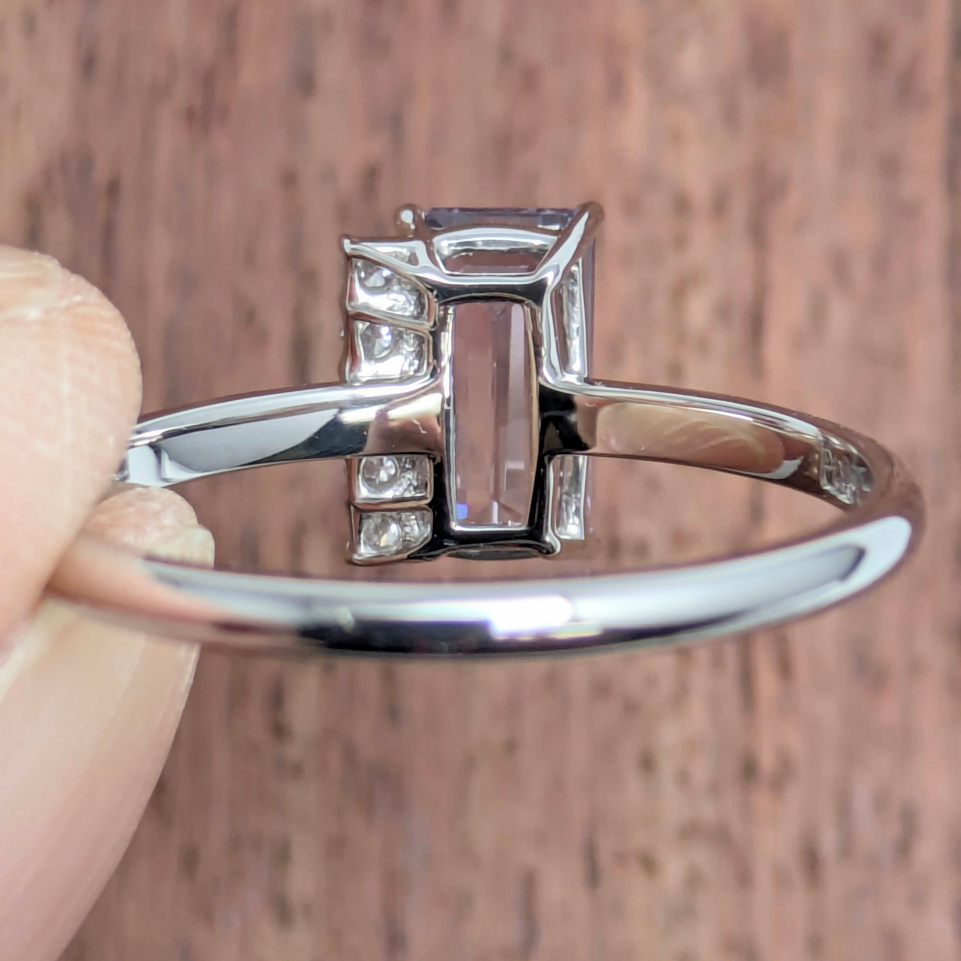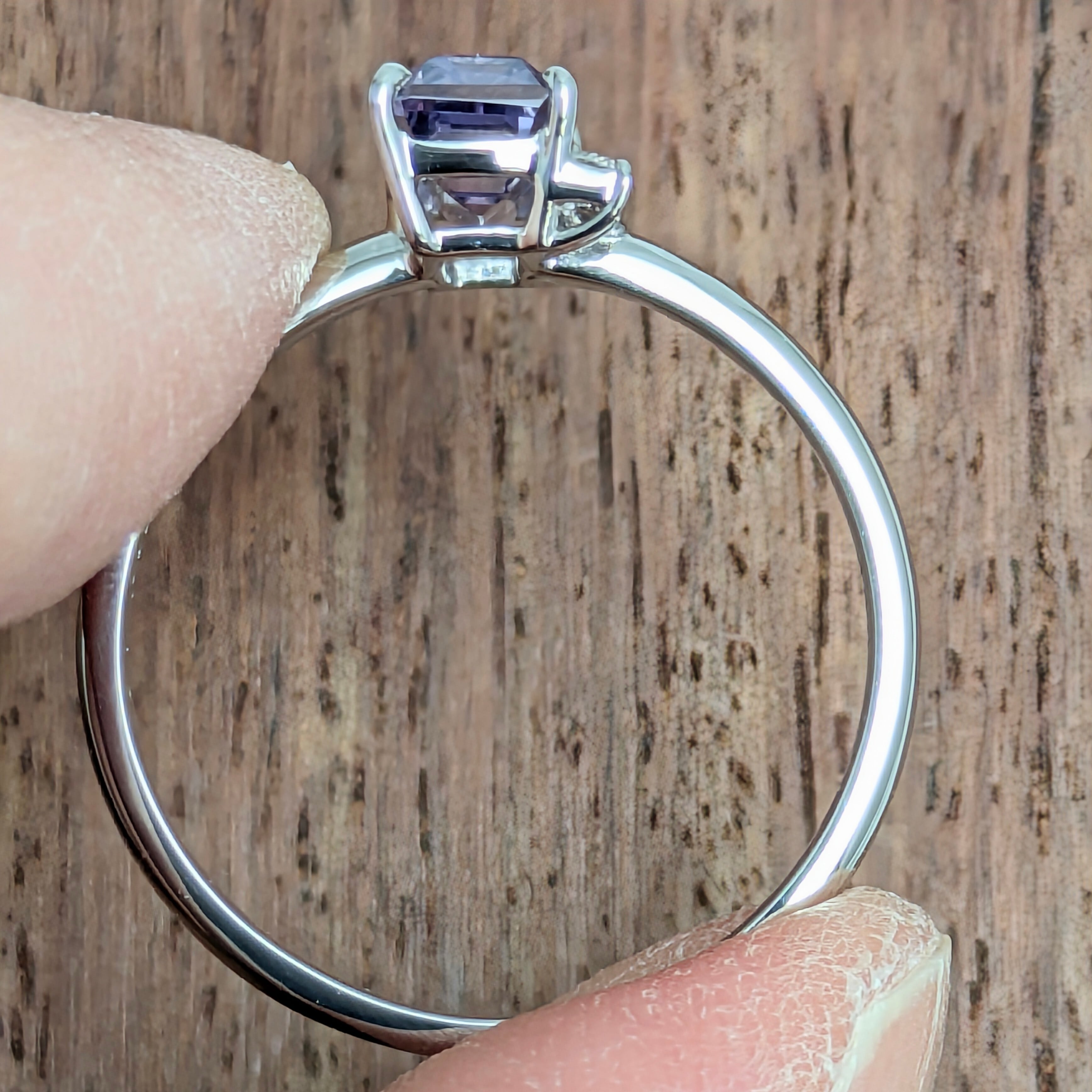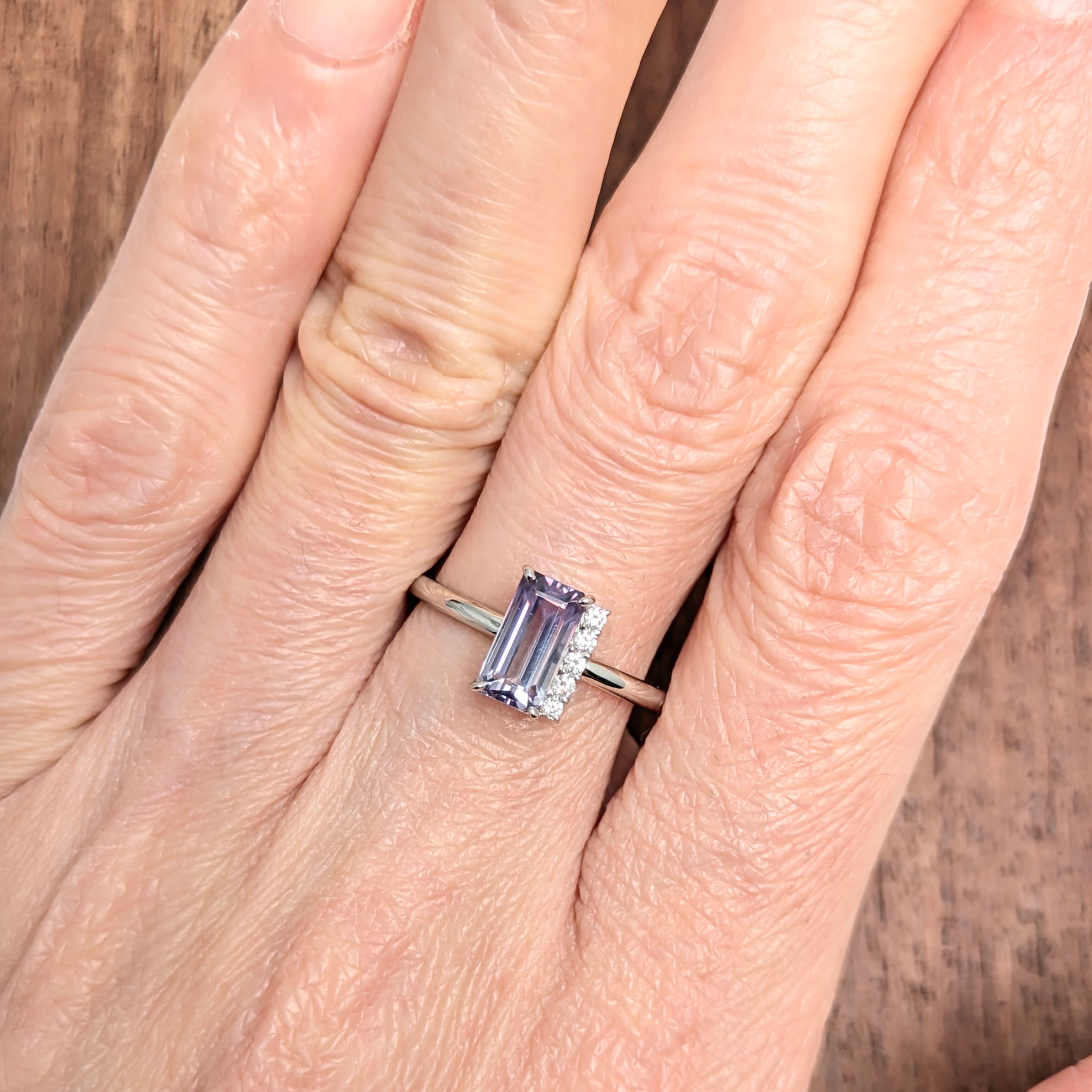 艶やかにグラデーションになっている、バイカラースピネル。その動きのある色の流れに倣うように、アシンメトリーに配置された5粒のダイヤモンドの煌めき・・・。当店オリジナルのデザインですが、仕上がりを見た瞬間にスタッフも「わあ・・・!」と声を上げてしまうほどのエレガントな仕上がりになっています。スピネルの強靭な性質とは対照的な、今にも消えそうな儚げなその色の移ろい・・・。あるべき対称性を排除することで、とても心を惹かれる魅惑的なリングに仕上がっています。