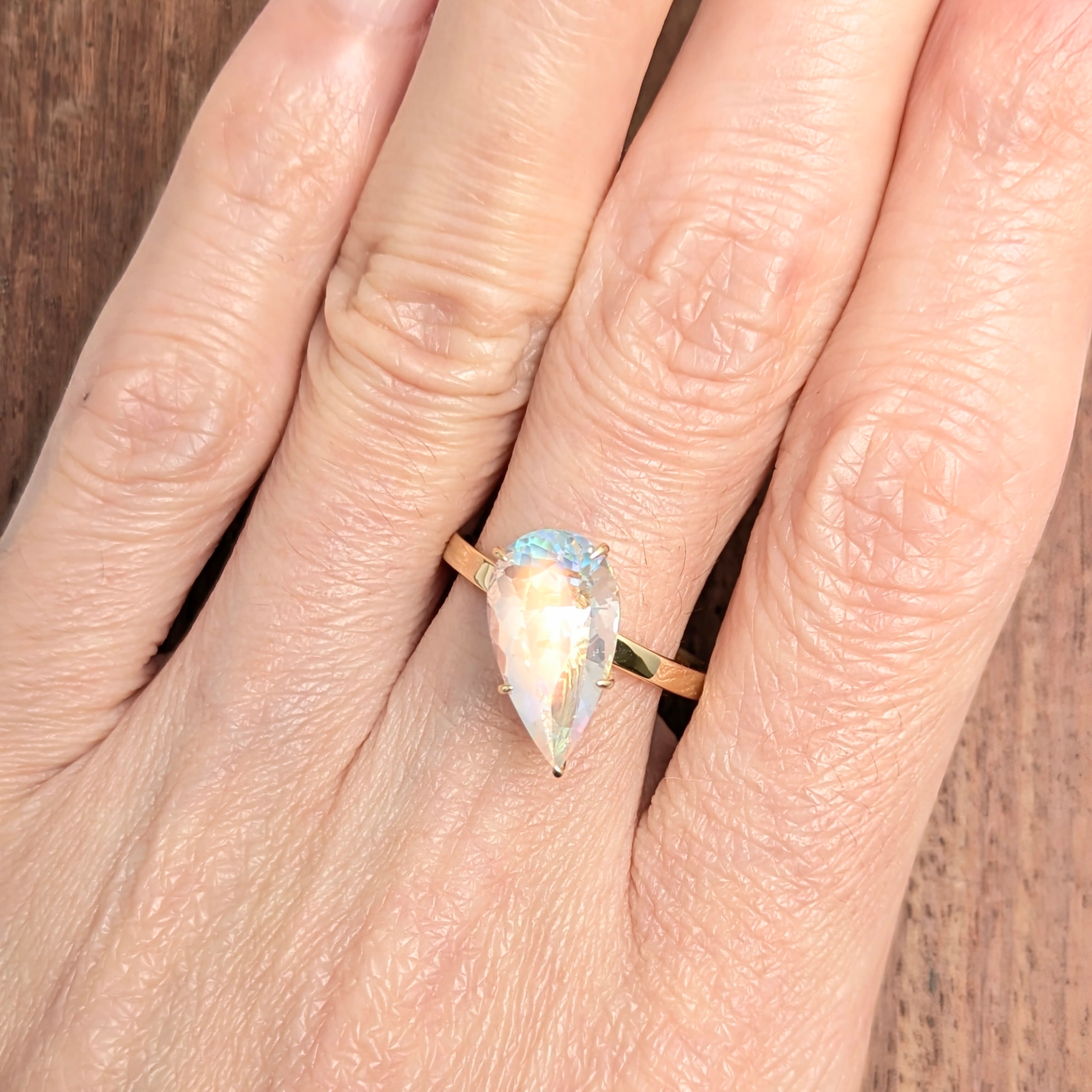 当店のスタッフが、練りに練った新作のリング。最大限にメインストーンを主役に据えた一作品です。3.28ctの大粒のムーンストーンを使用し、「石の美しさ」と「着けこなすバリエーション」を併せ持たせたデザイン。世界を彩る「七色」全てを美しく閉じ込めたメインストーンには、あらゆる方向から光を取り込み、最高に美しいシラーが見えるようにセッティングされています。ちょっと腰高の台座は重ね付けにも最適!お手持ちのデザインリングとの相性もバッチリです。上下を逆にしてはめると、また雰囲気も一新。貴方ならではの装い方で、この輝