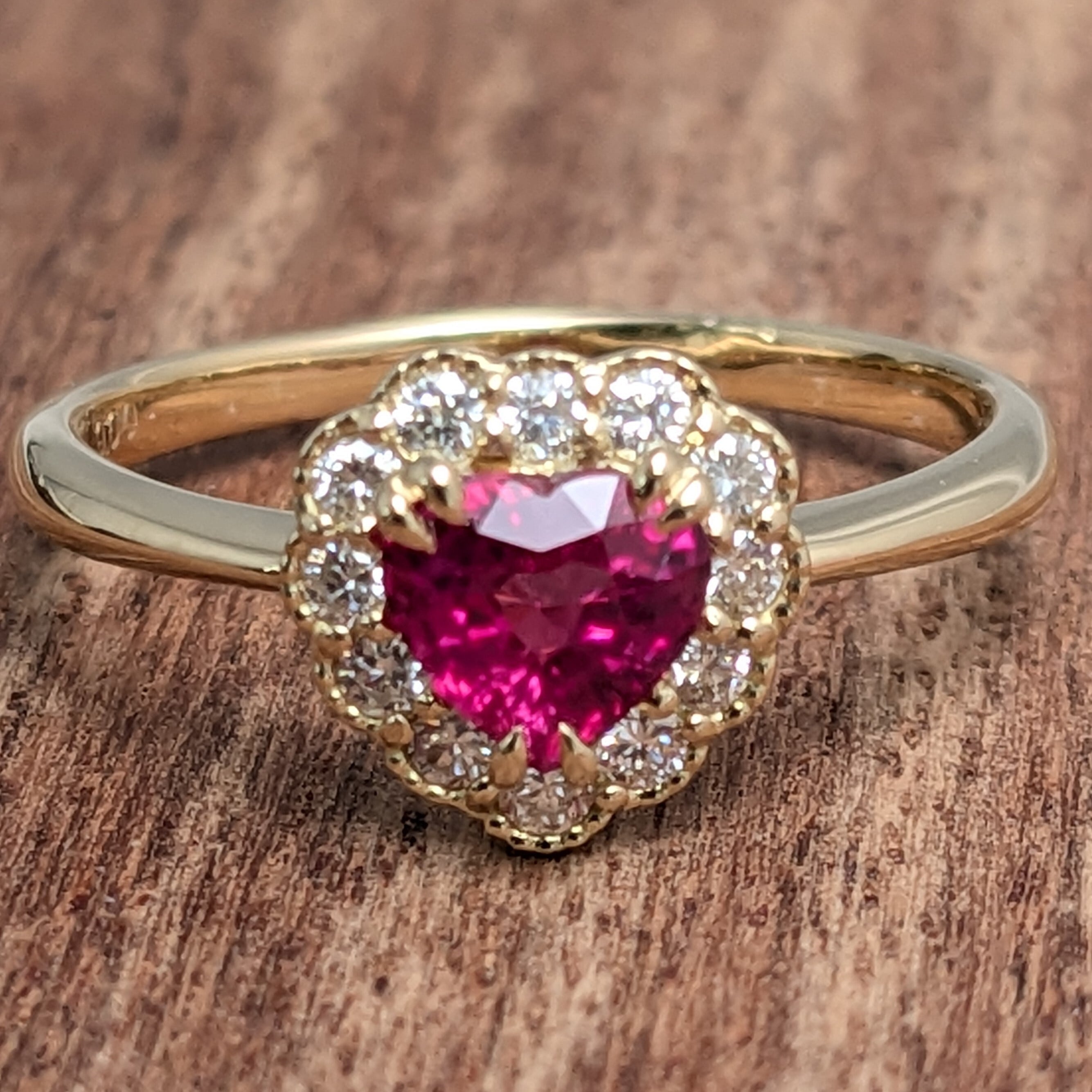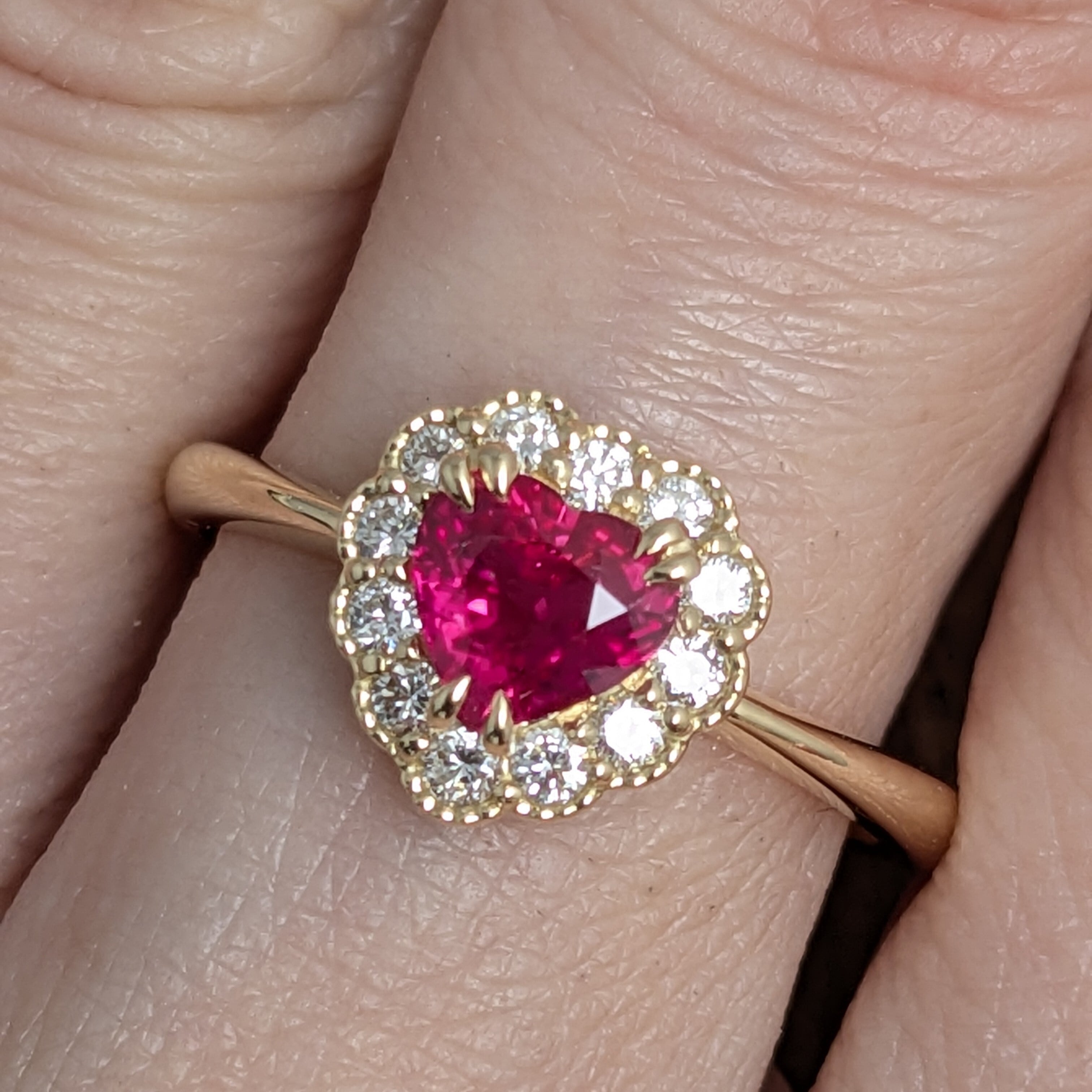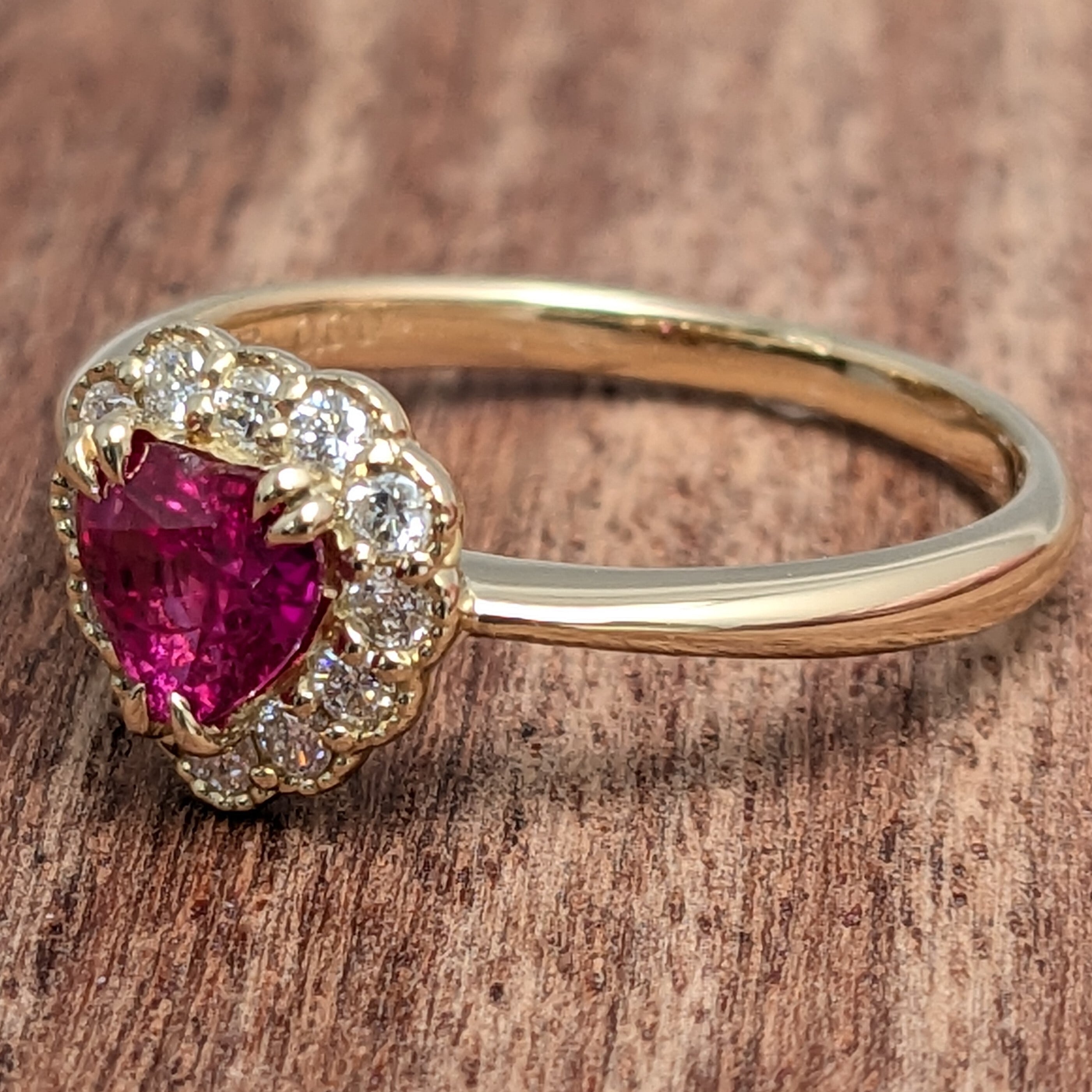 指に宿る愛の鼓動・・・鮮やかなピンキッシュレッドにウットリと見惚れてしまう新作デザインのリングです。使用しているのはビルマ産の上質な一粒。「鮮赤色」の蛍光性を持ち、太陽の下ではさらに燃えるように色と光を放ちます。デザインの一つとして組み込まれた割爪もインパクトあり。ミル打ちされたキュートな枠に、キラキラと輝くダイヤモンドとの相性もバッチリです。初めて口紅を塗った時の気持ちを思い出すような、そんな心ときめく赤色の輝き。是非、太陽の下でご覧ください♪