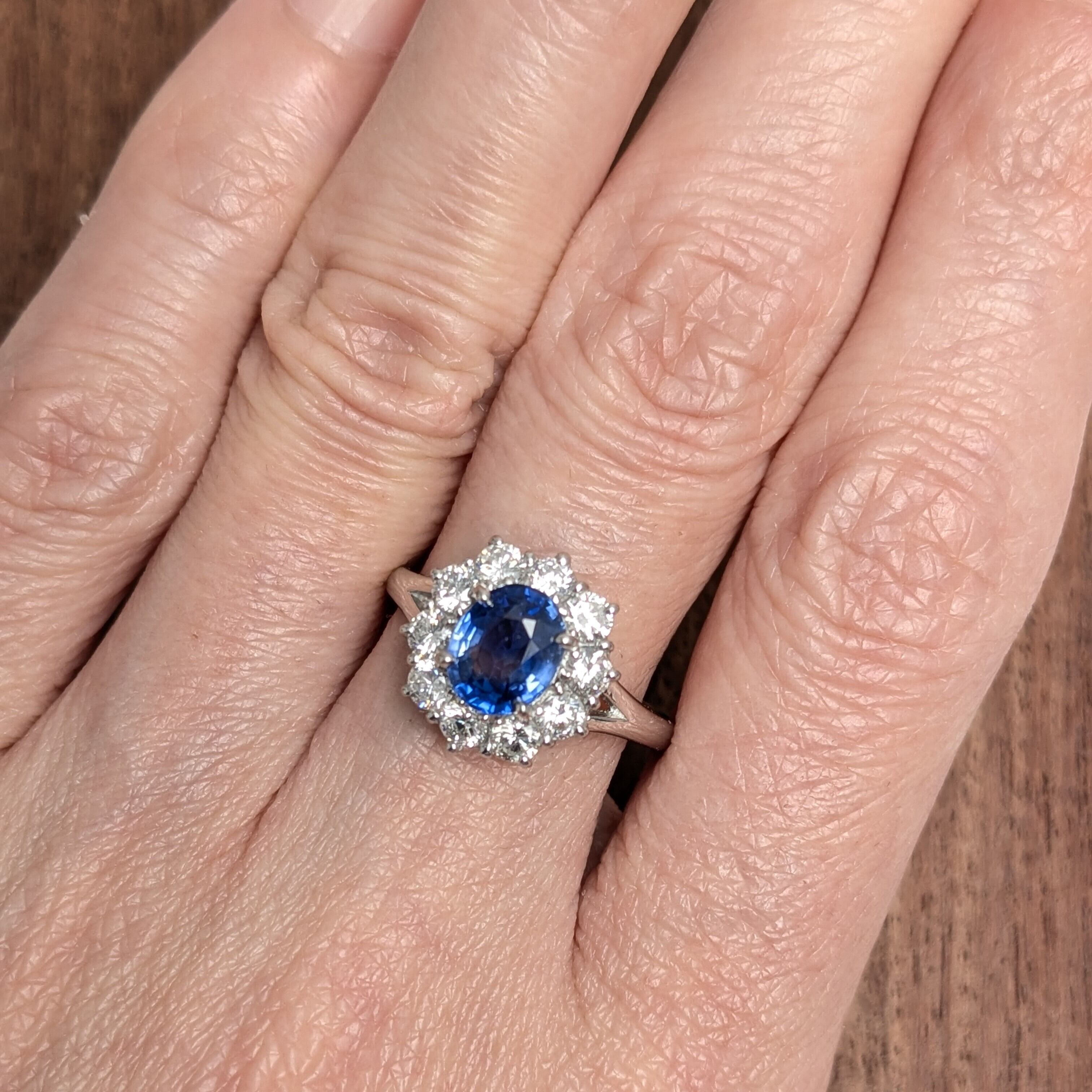ミャンマー産の非加熱サファイアです。角度を変えるとほんのりと色のムラが感じられる瞬間もありますが、輝きも強く濃すぎず薄すぎない色合いがとても魅力的です。枠は当店のオリジナル。シンプルなフラワーモチーフですが、10粒の厳選した輝きの強いメレダイヤを使用しています。ルーペで覗くと、サファイアの中には煌めくシルクの虹色が・・・!“非加熱”の個性がギュッと詰まったブルーサファイアを使用しました☆